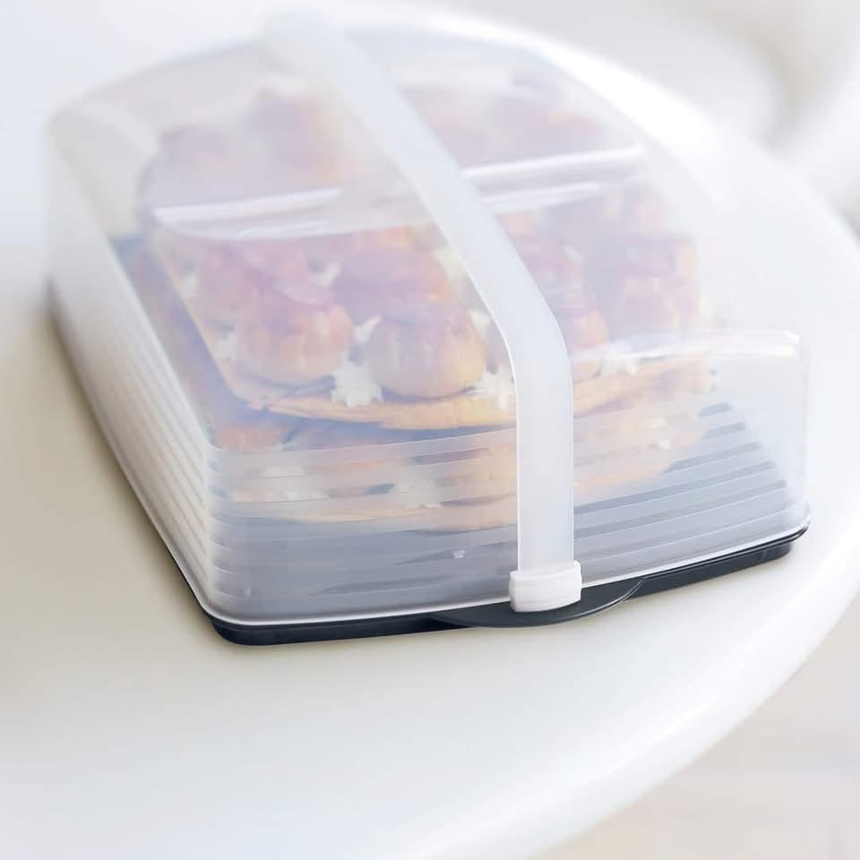 A Cukrászmester egy roppant elegáns tálaló, amiben biztonságosan szállítható bármi. Szuper frissentartó edény, amibe egy tepsi krémes, vagy akár 3 rúd bejgli is kényelmesen elfér!